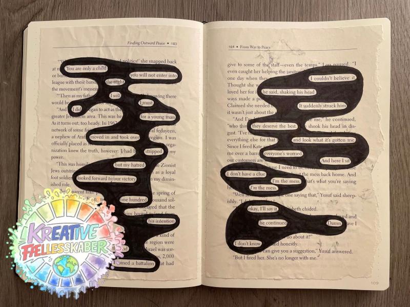 Gellerup BibliotekMed black out poetry skrives digte på en fri og kreativ måde, hvor blyanten er skiftet ud med tusser, farver, lim og papir. Ud fra en tekst i en bog eller digtsamling udvælges ord, som skal stå tilbage. Alle de andre ord og sætninger tegnes over, og dermed skabes et helt nyt og unikt digt. Det er kun fantasien der sætter grænser med mønstre, faconer, udtryk og farver.