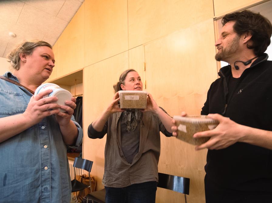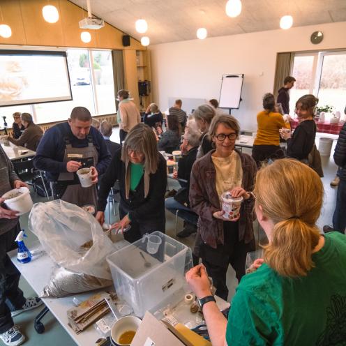 Deltagerne havde egne bøtter med. De blev hullet, afsprittet og beklædt med englehud før halm, mycelium (på korn) og vand blev tilført. Dette miks skal derpå passes og plejes og siden høstes 😊 30 små hjem er nu i gang med at gro egen mad.