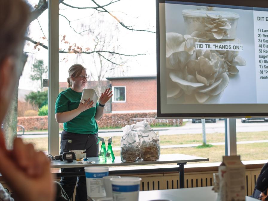 Svampearrangementet begyndte ved at Julie fra TagTomat fortalte om kunsten selv at dyrke østershatte både inde og ude og helt konkret vejledte i hvordan.